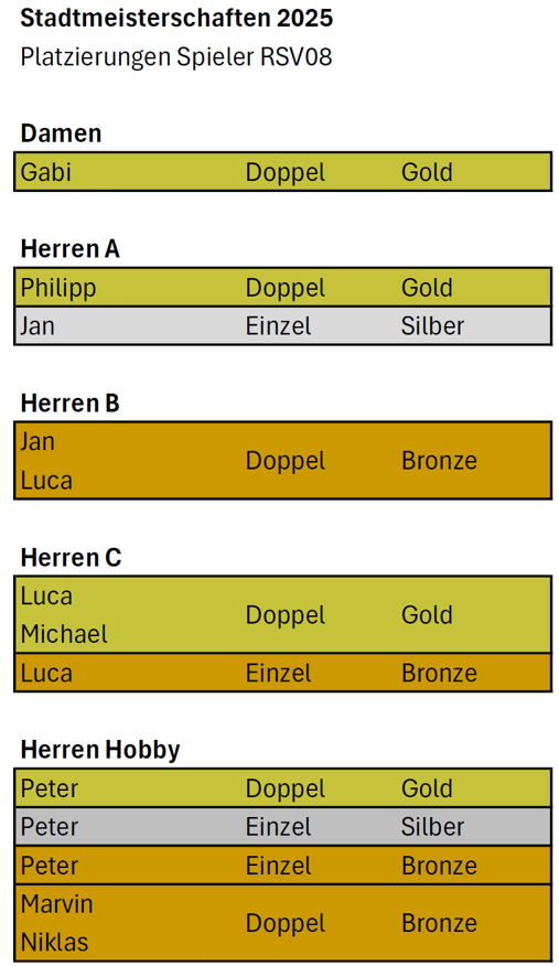 Am Ende durfte sich der RSV08 über viele Podestplätze freuen. Die Stadtmeisterschaften waren ein voller Erfolg und haben gezeigt, dass der Tischtennissport in Langenfeld lebendig und attraktiv ist. Ein großer Danke gilt den Organisatoren, Helfer/innen vom SSV Berghausen für die Ausrichtung, sowie allen Spielerinnen und Spielern für ihre Teilnahme.